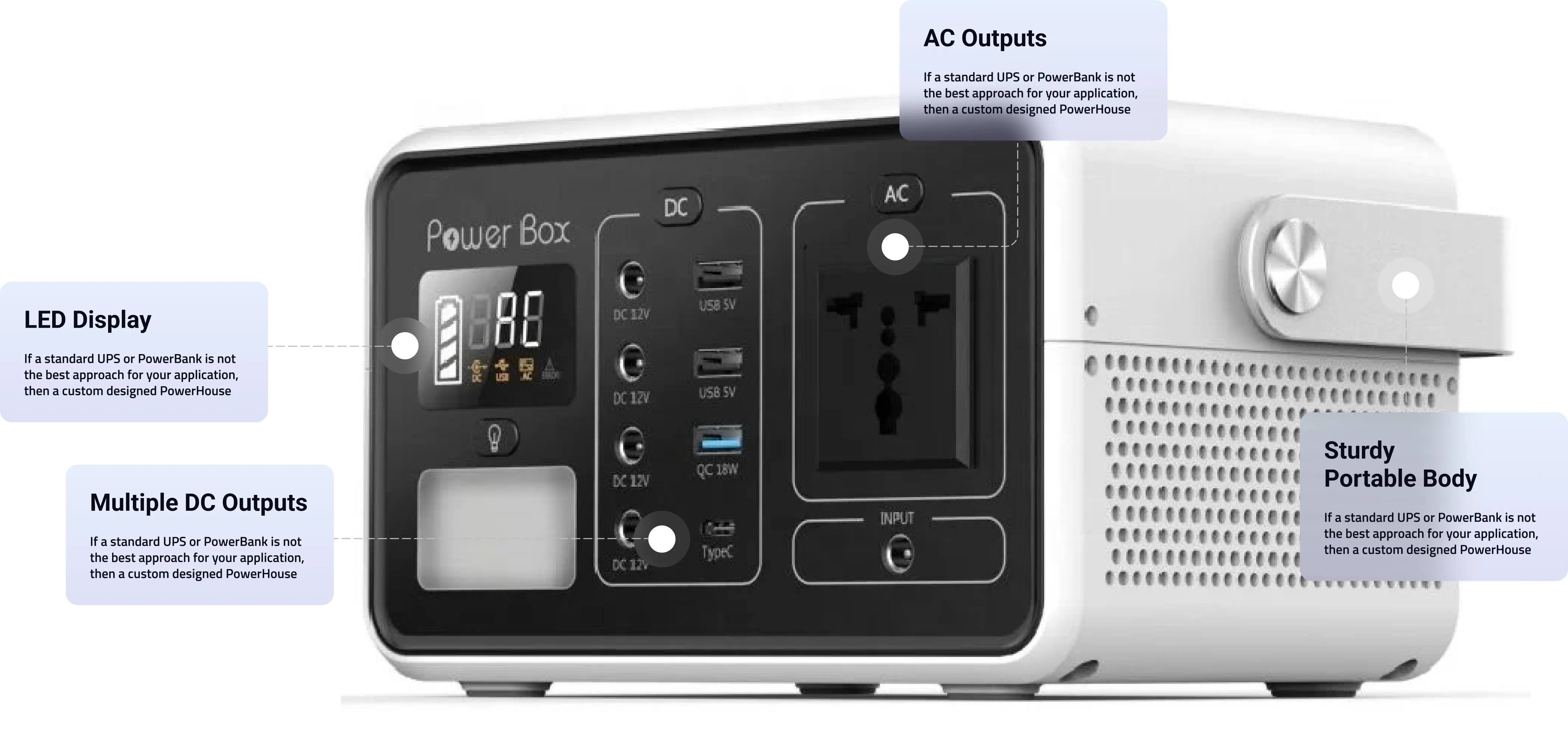 If a standard UPS or PowerBank is not the best approach for your application, then a custom designed PowerHouse product may be the best solution. Custom design can either be a modification of an off-the-shelf UPS Device or a full custom design for a completely new PowerHouse product built from the component level keeping portability in mind. Our portable customised UPS range includes DC Power Banks and DC UPS up to 3,00,000 mAh EV Grade Battery and 300 Watts of power output.