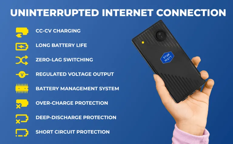 With the Starwatt Mini UPS for Wi-Fi Router, Stay connected to the Internet, even during power outages. Featuring an intelligent battery management system, Router Online UPS charges itself when connected to electricity. The built-in power line detection circuit of Router UPS ensures switching between the power line and battery without any delay which keeps the device running during power cuts and switch over to generators. Let’s you keep your ZOOM or Video Calls / your kid’s online classes/ your video yoga or gym session and Work from Home running without any interruption, VPN disconnect or conference call drop.