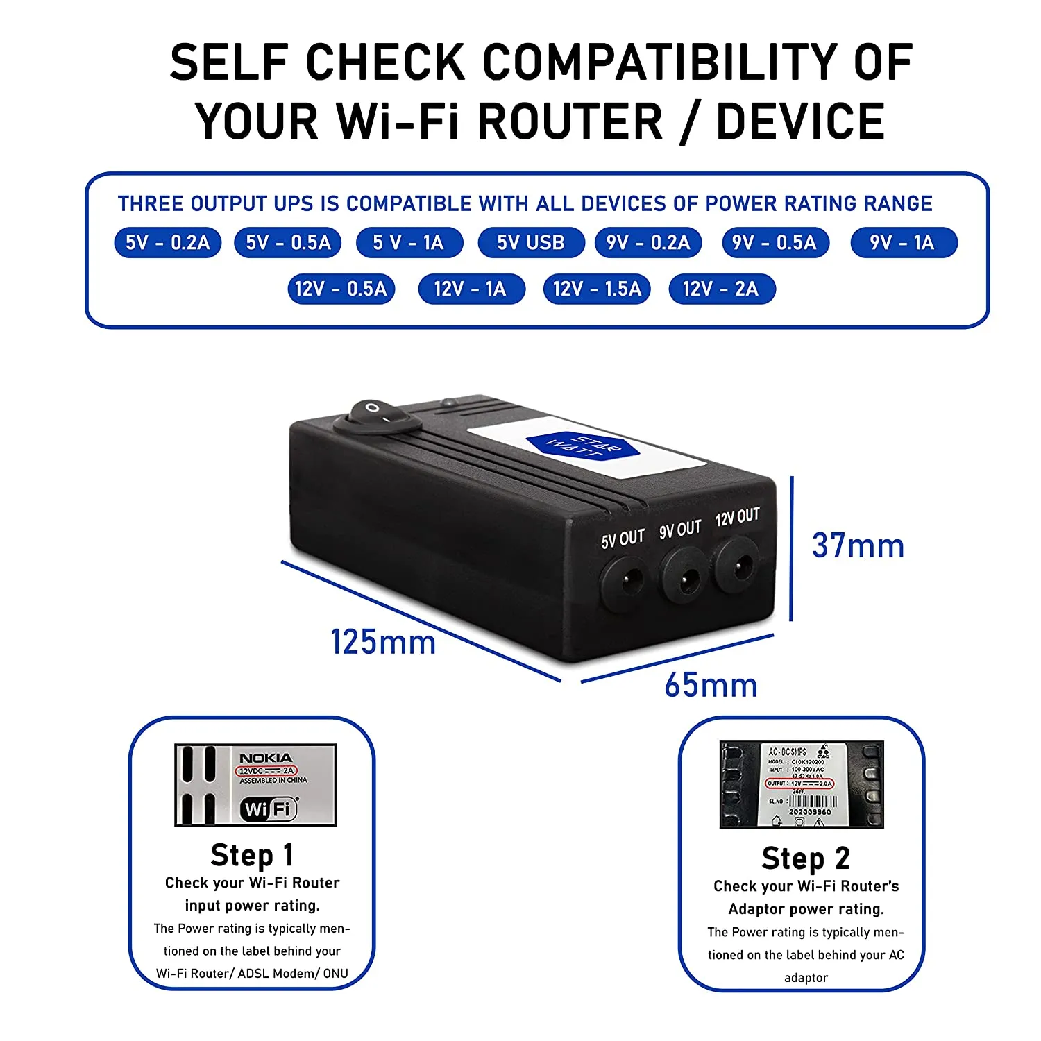A: Starwatt Wi-Fi Router Online UPS has a range of models that supports 5V, 9V, 12V powered Wi-Fi, Wi-Fi/ADSL Router. We also provide dual and triple output devices. Please ensure power compatibility by looking at the specification sticker on the backside of the Router/Modem and power adaptor before you place the order.
