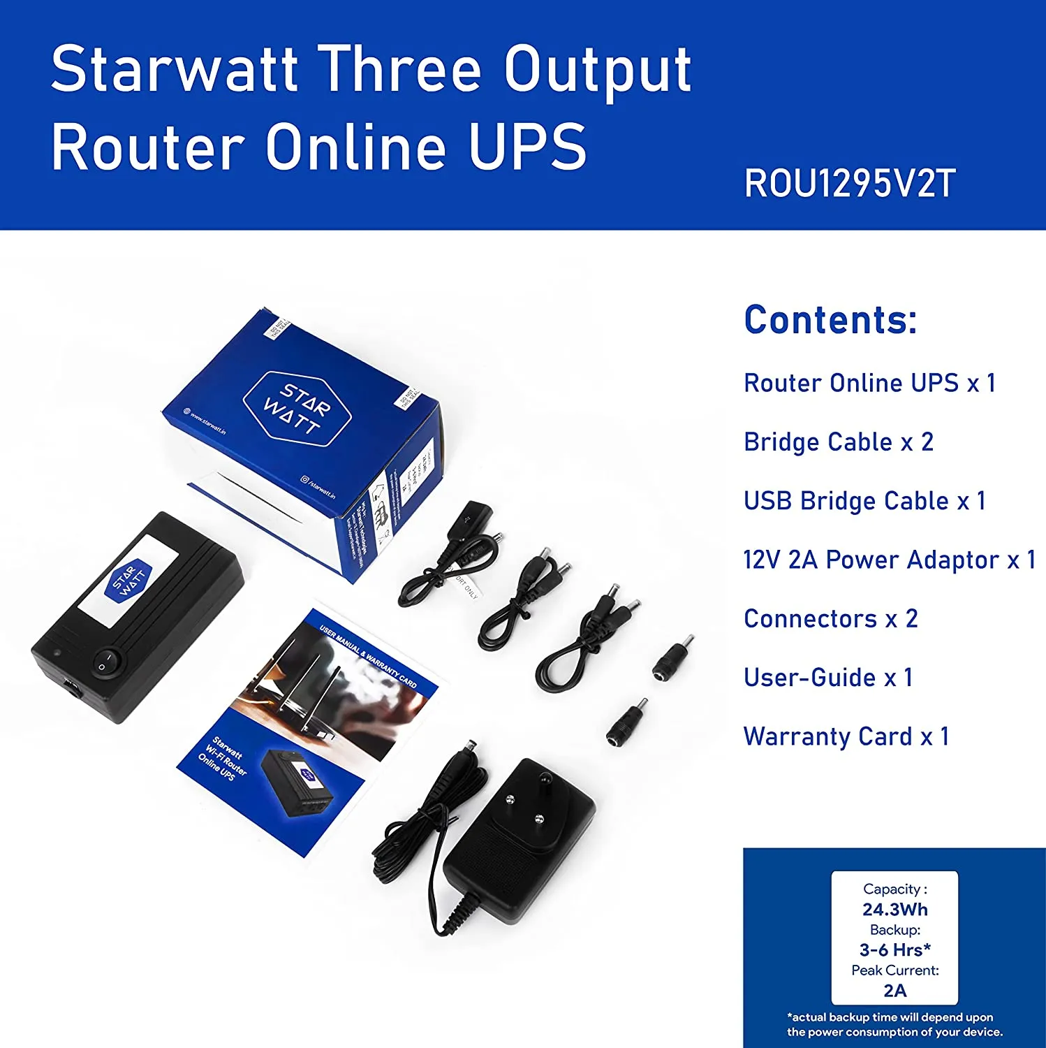 | Number of Items | Router Online UPS (1), Bridge Cable (2) Power Adaptor (1), Connectors (2), User-Guide (1) & Warranty Card (1) |